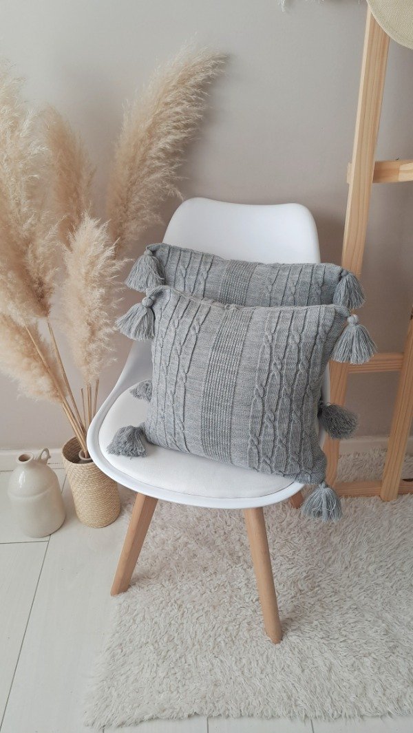 Almohadón tejido en lana, con detalles de borlas en las puntas.